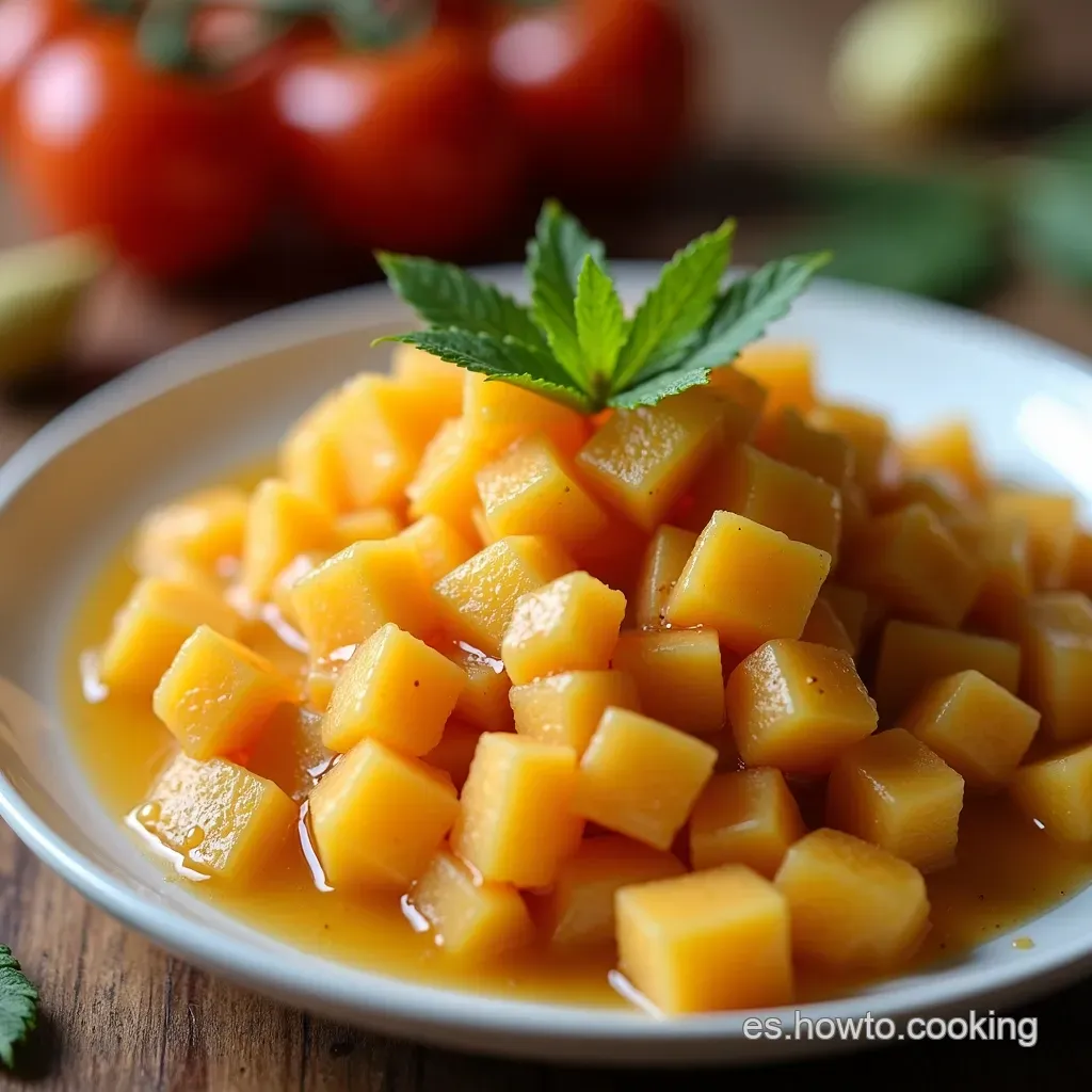 - Plating: No te compliques mucho. Sirve el Camote en dulce en un plato hondo. Agrega un poco del almíbar por encima. ¡Y listo! Si quieres elevarlo, ponle una hojita de menta fresca. ¡Se verá super fancy !